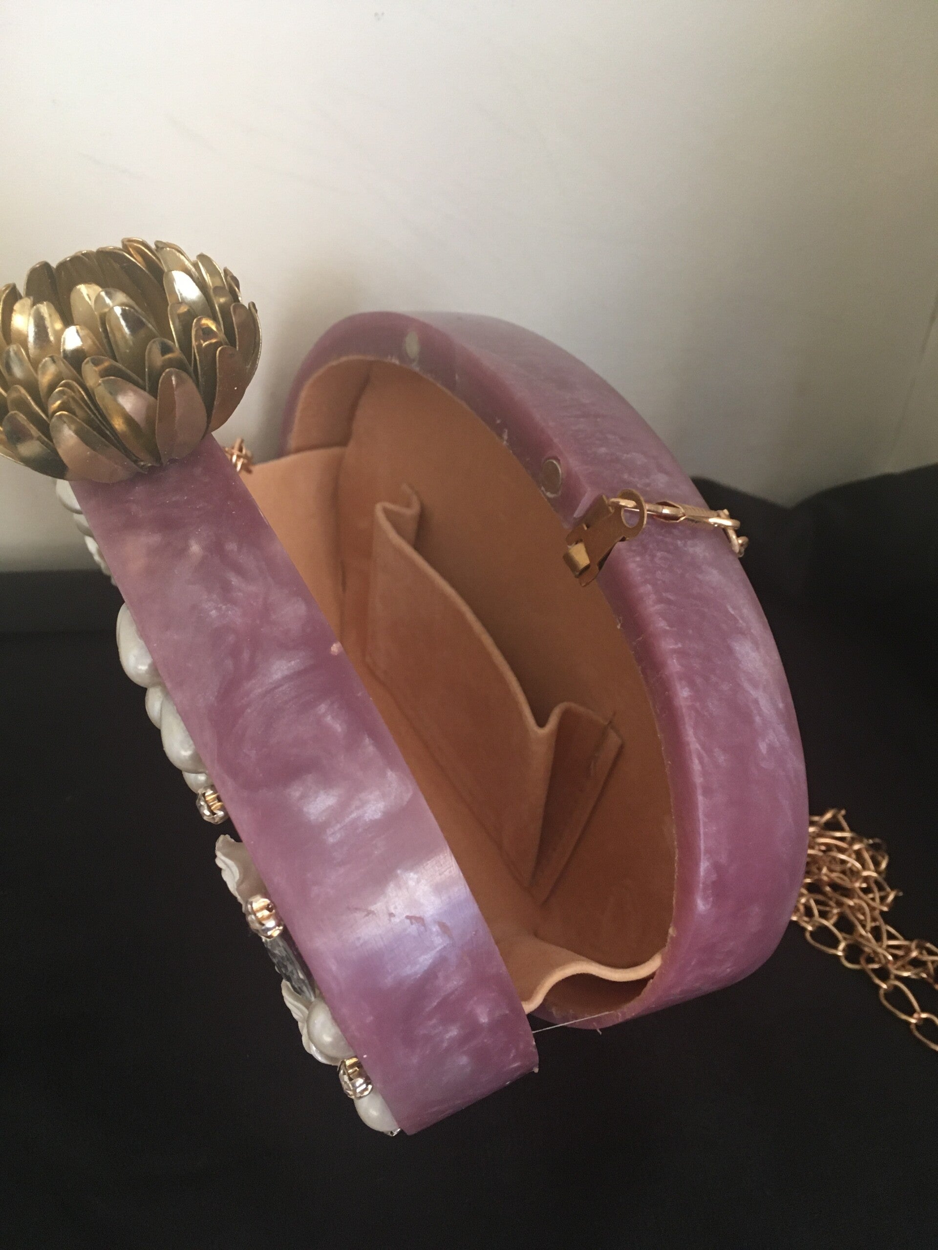 StudioAvai003 CLUTCH PURSE Mauve Marble Resin Felted Lining Inner Pocket Gold Plated Findings Mother Of Pearl Embellishments